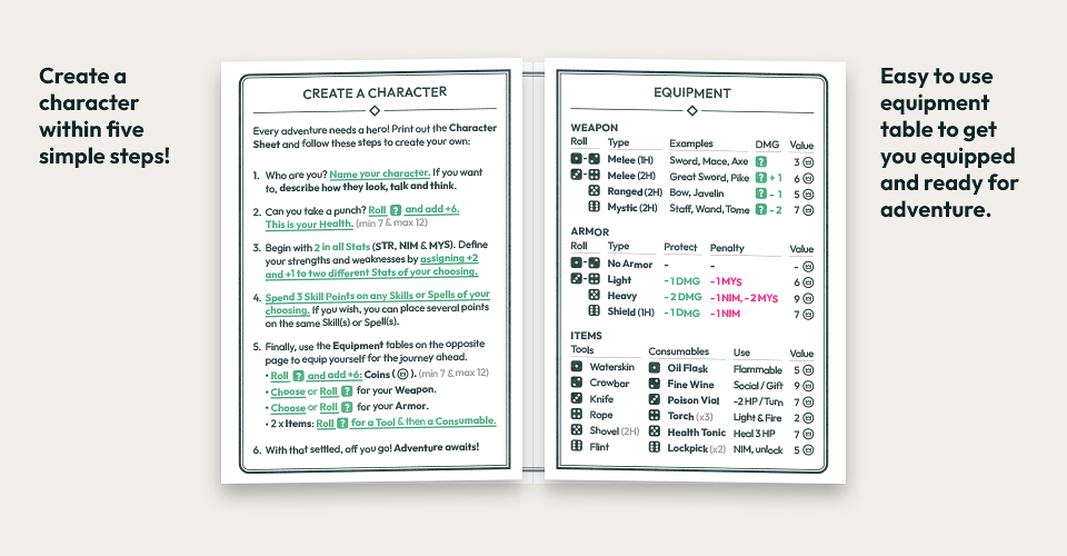 Mini Myth is a single-page tabletop roleplaying game, that (literally) fits in your pocket!