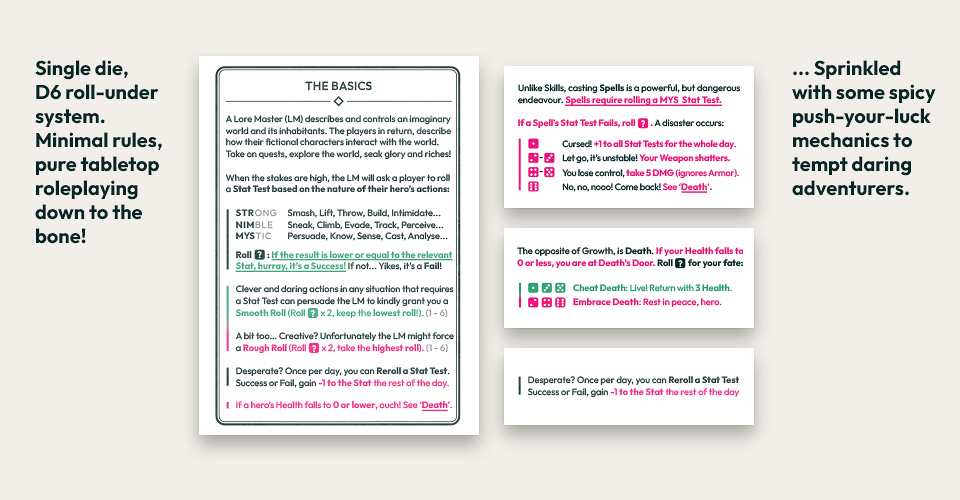 Mini Myth is a D6 roll-under rules-minimal roleplaying system, which is extremely simple, quick and easy to learn. It's a design passion project with the goal of distilling the tabletop roleplaying experience to a single page, while still achieving a fairly complete little roleplaying rules system.